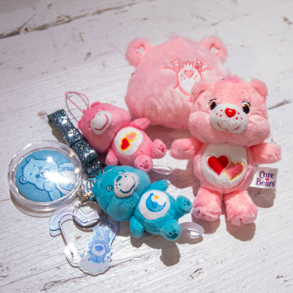 小学生の頃から好きだったケアベアグッズです。ブームが再燃しているようでうれしいです!UFOキャッチャーの景品になっているので、獲れるとうれしくてインスタに上げていたら、お客さまがプレゼントしてくれるようになりました。ちなみにお仕事バッグにはお客さまからいただいたものをつけています。