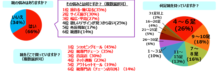 アンケート調査の結果、60代女性の66%が靴に関する悩みを抱えており、悩みのトップは「疲れる・痛くなる」ことと判明。続いて「サイズ選び」「幅広・甲高」「外反母趾」など、健康面とフィット感に関する問題が目立った。