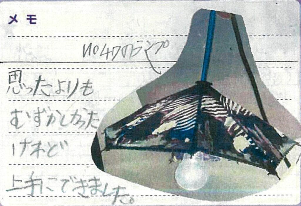 僕が「SANYO服福賞」と聞いた時は、びっくりしたのと嬉しい気持ちでテンションが上がりました。お母さんのお気に入りの傘からランプシェードとバッグを作ったのはけっこう大変だったけど、おばあちゃんやみんなが手伝ってくれました。